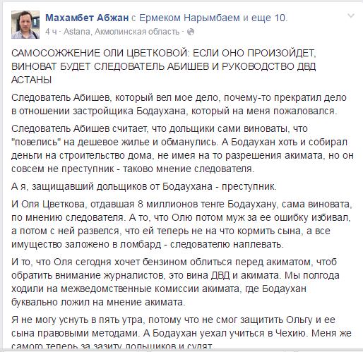 Далее он приводит пост, в котором прямо обвиняет в намерении самосожжения Цветковой некоего следователя Абишева и руководство ДВД Астаны.