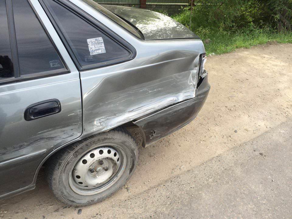 От сильного удара немецкая автомашина по инерции влетает в столб и дерево. По словам водителя Nexia, в BMW сидели пять человек, которые скрылись с места аварии.