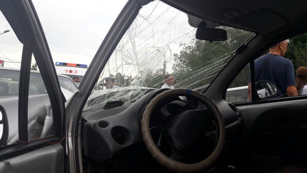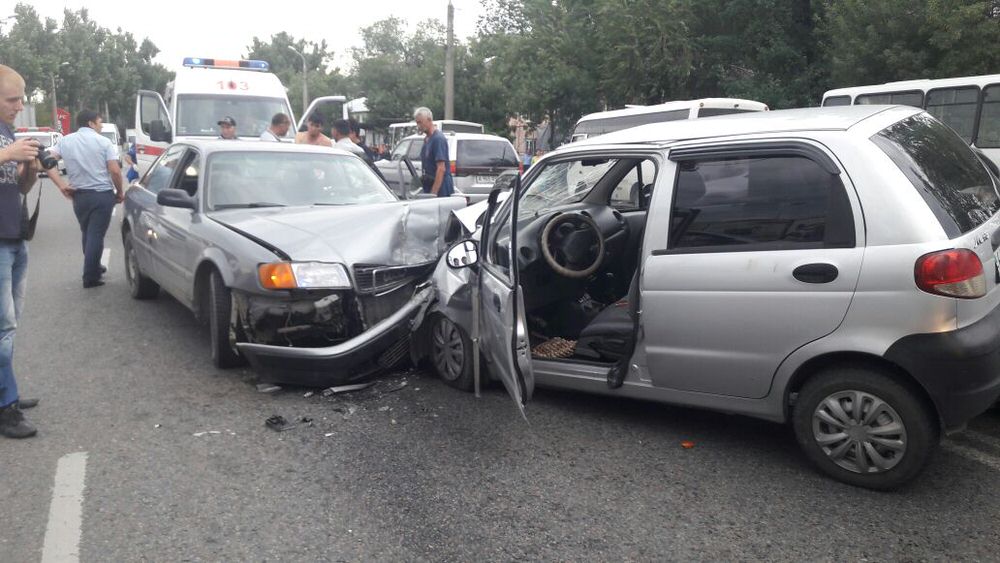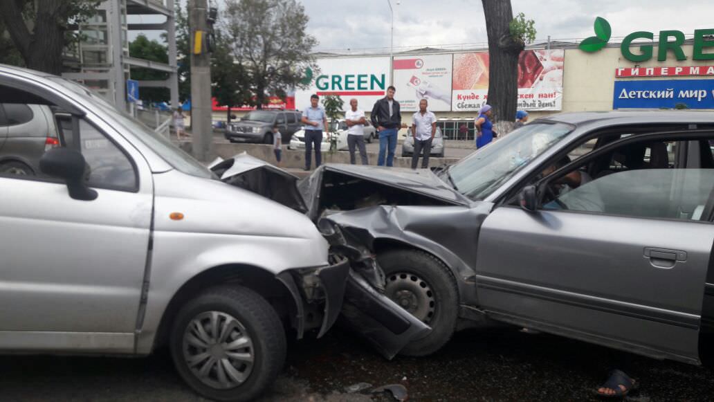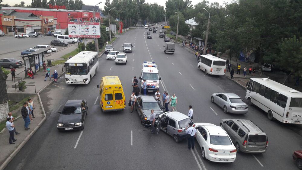 Белый Mitsubishi Lancer ехал по Суюнбая в северном направлении, за ним в потоке двигался Daewoo Matiz. Находившаяся за рулем Mitsubishi девушка резко ударила по тормозам из-за выезжающего с остановки автобуса. Matiz, чтобы не допустить столкновения, выехал на полосу встречного движения, где врезался в автомашину марки Audi. В этот же момент Mitsubishi Lancer, оказавшийся сзади, въехал в Matiz.
