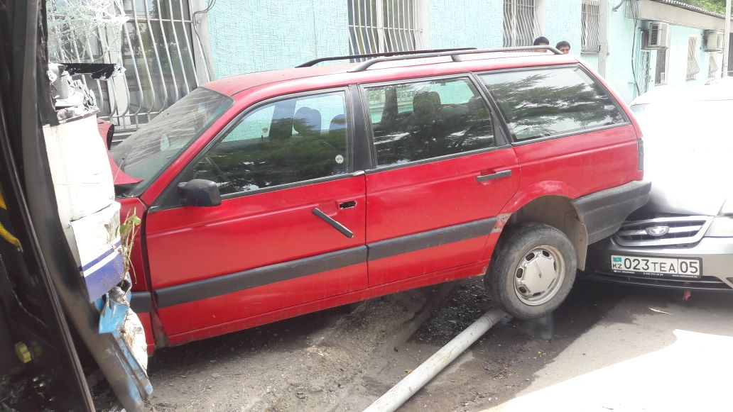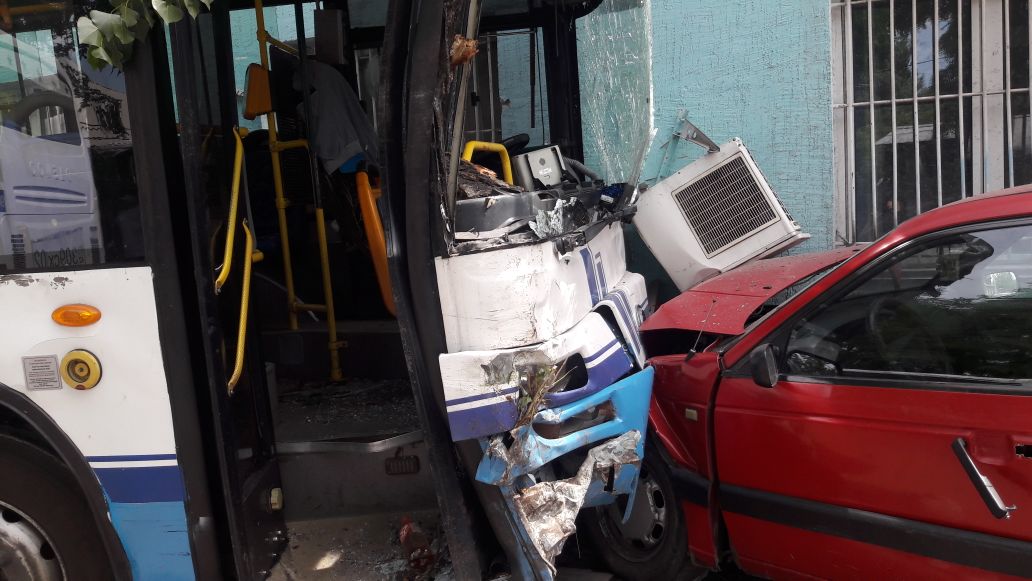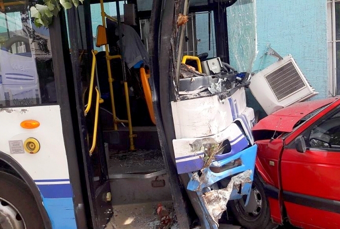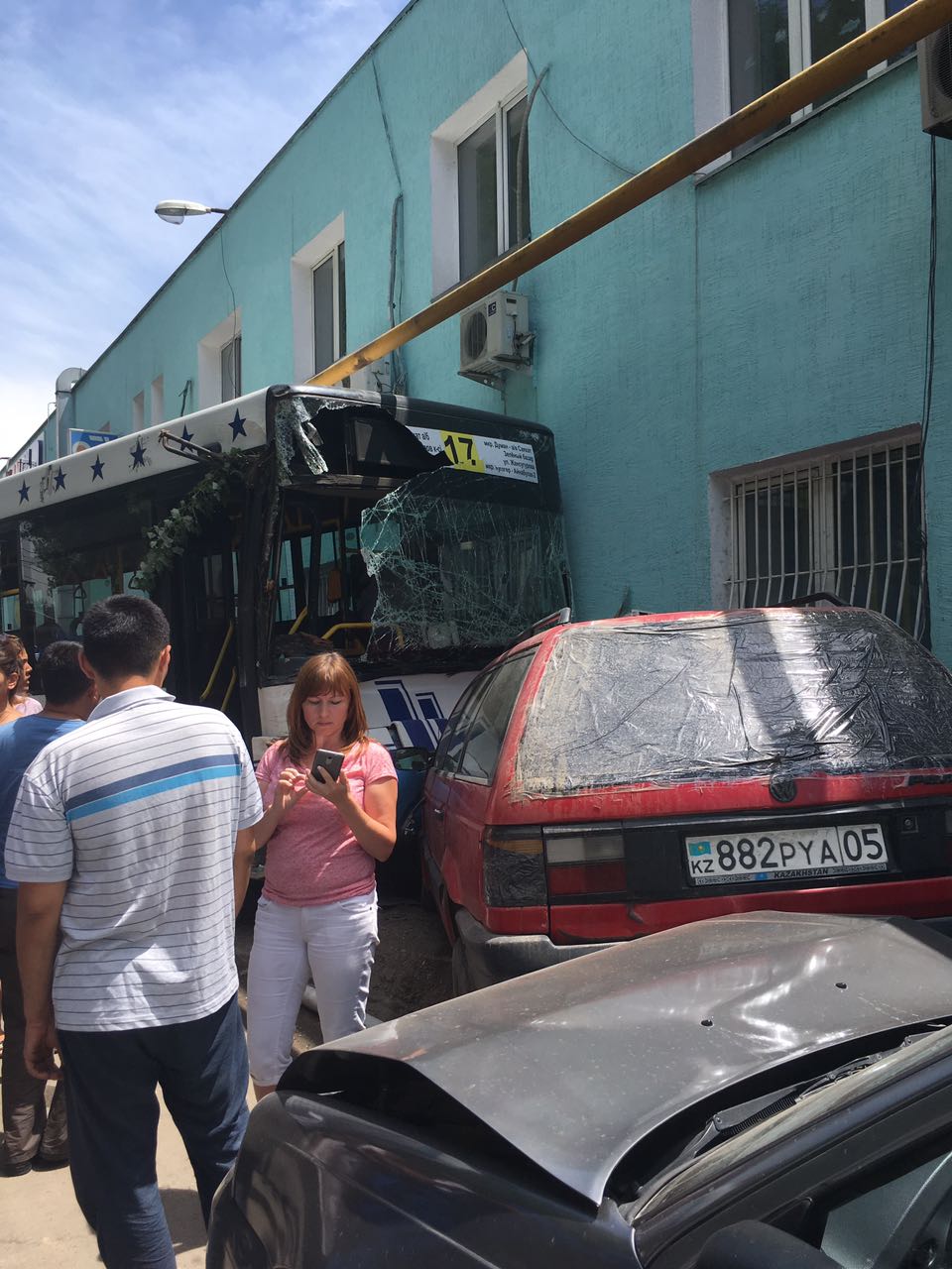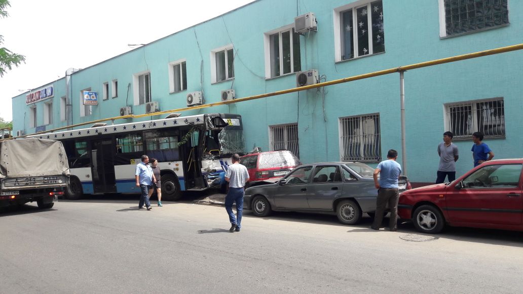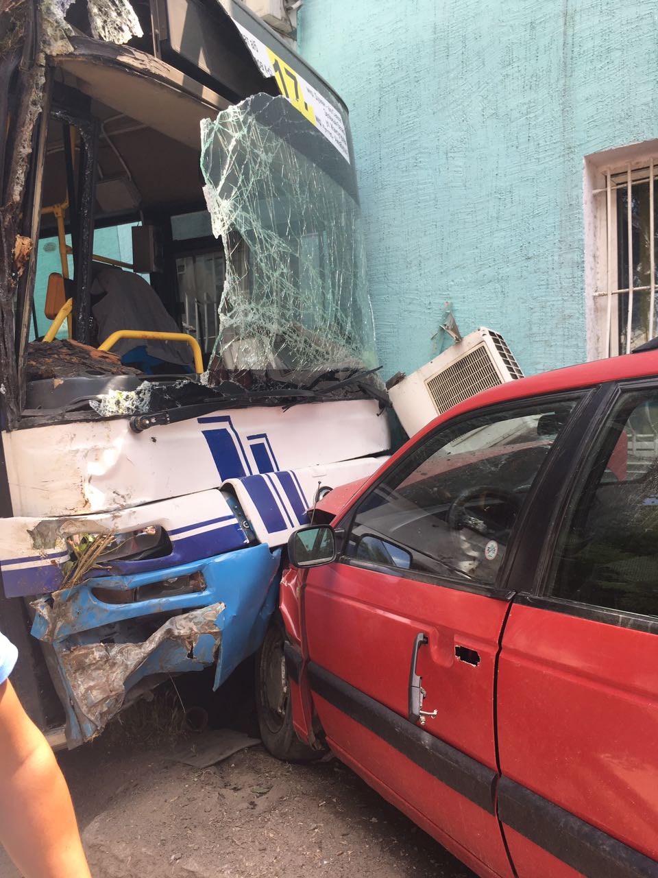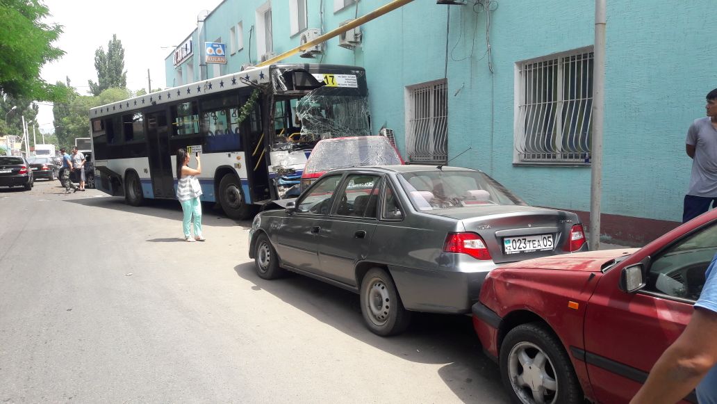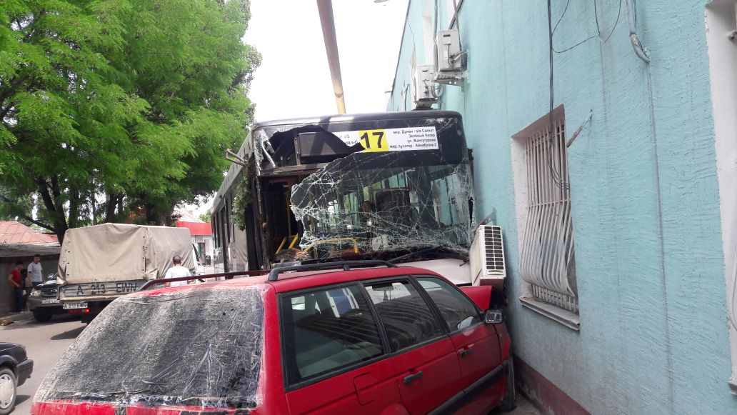 Два автобуса 17-го маршрута двигались навстречу друг другу, один - в восточном, другой - в западном направлении. В это время перед автобусом, который двигался в восточном направлении, из-за шлагбаума из автобазы выехала машина Рено. Водитель 17-го маршрута испугался, что зацепит ее, и резко вывернул руль влево, врезавшись при этом в автобус №17, который ехал в западном направлении. Тот автобус, в свою очередь, все же задел Рено, после чего врезался в дерево. После этого его по инерции откинуло на три припаркованных автомашины. В конце-концов автобус врезался в административное здание. В этом ДТП пострадало более 6 человек.