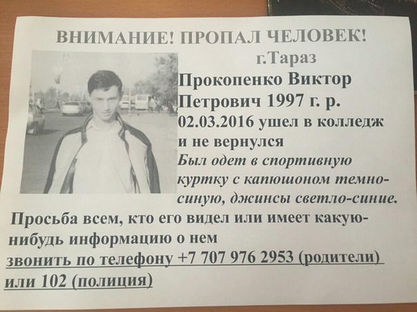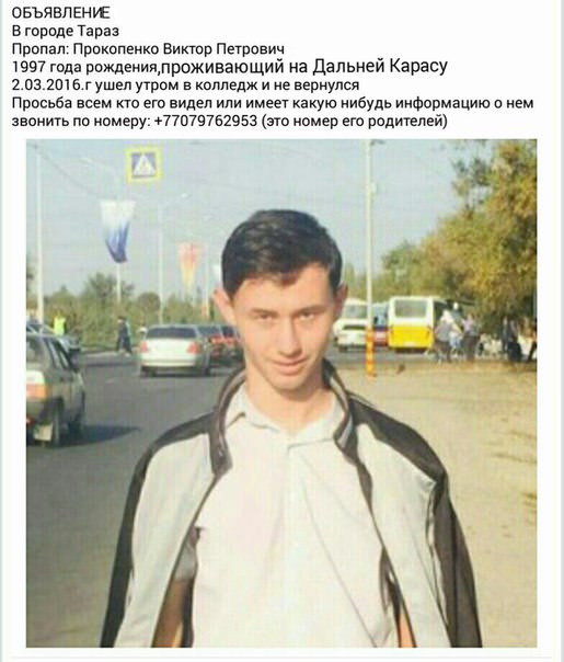 Виктор Прокопенко в день исчезновения присутствовал на всех парах в Жамбылском политехническом колледже и даже получил пятерку. В 13:40, выйдя из здания учебного заведения, пропал.