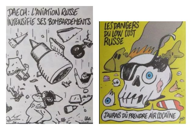 Сатирический журнал Charlie Hebdo опубликовал две карикатуры и шутку на крушение российского самолета Airbus A321 «Когалымавиа» на Синайском полуострове. Об этом сообщает телеканал РЕН ТВ.