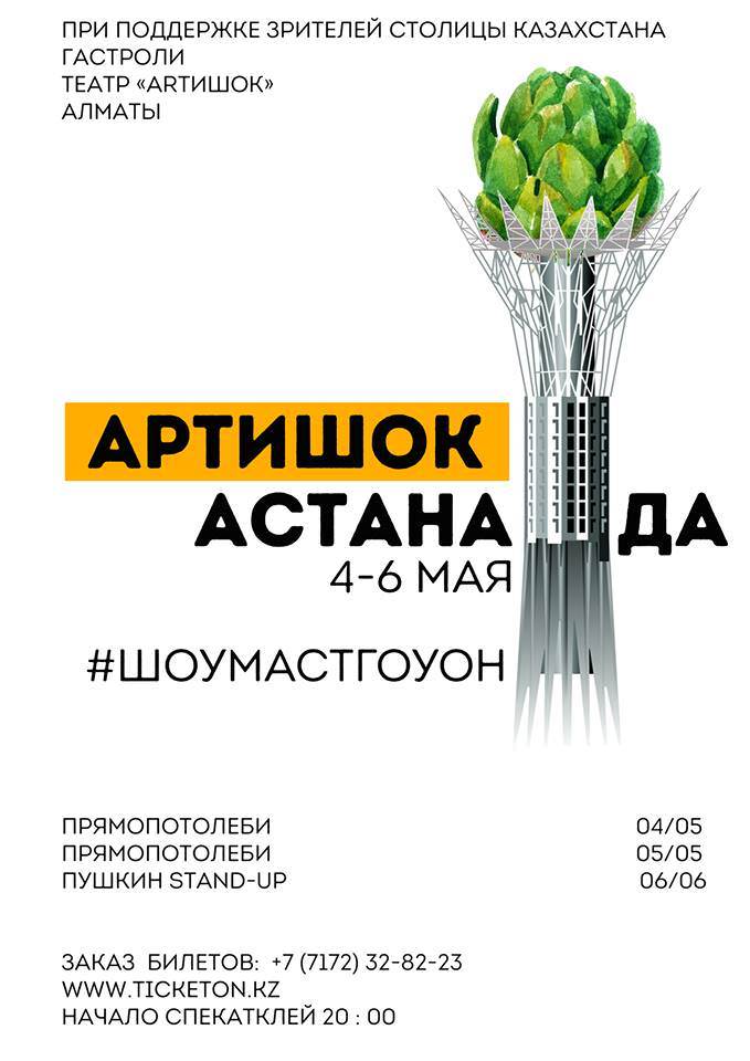 Гастроли в Астане ARTиШОК планирует начать через несколько дней: 4 и 5 мая должны состояться показы спектакля «Прямопотолеби», 6 мая – «Пушкин stand up».