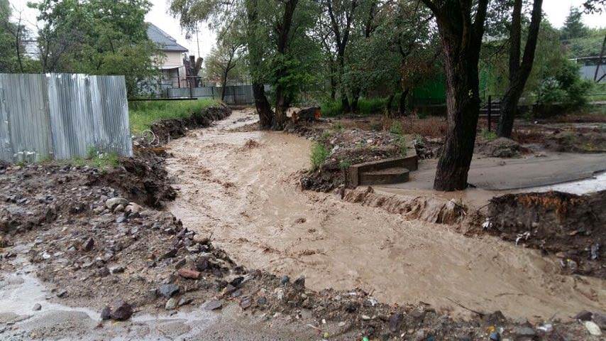 Из-за строительных работ выше базара в Каменке дождевые потоки переполнили реку Каргалинку и разлились по улице Джандосова.