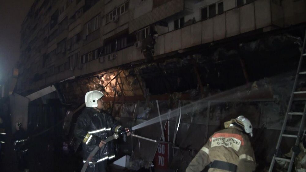 В 20 часов 19 минут поступил звонок на пульт «101» о том, что горит магазин по адресу: Алмалинский район, проспект Жибек жолы, дом 81. В 20 часов 24 минуты прибыло первое подразделение и передало с места вызова: «горение утеплителя перекрытия магазина «Mango» и «Gold Shop» пристроенного к девятиэтажному жилому дому».
