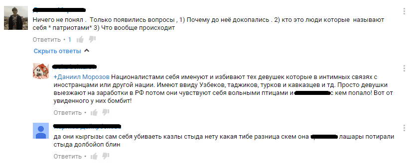 Авторы видео заставляют девушек рассказать, откуда они, как их зовут, называют их «бесстыжими». На вопрос, почему они не встречаются с кыргызами, одна из допрашиваемых отвечает: «Кыргызские парни меня обокрали, много раз обещали жениться, а сейчас мой бывший парень живет у меня на квартире со своей русской девушкой. И после такого считается, что я себя недостойно веду?».