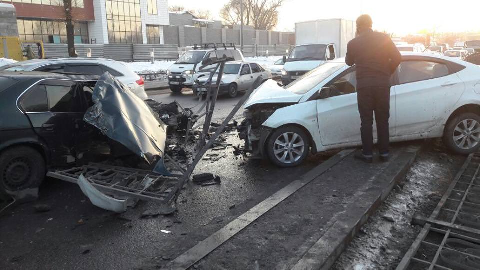Снеся две или три секции забора, иномарка врезалась в фуру, которая в тот момент ехала в восточном направлении по Рыскулова. Пробив большегрузу два колеса и повредив амортизатор, BMW столкнулась со встречным автомобилем Hyundai.