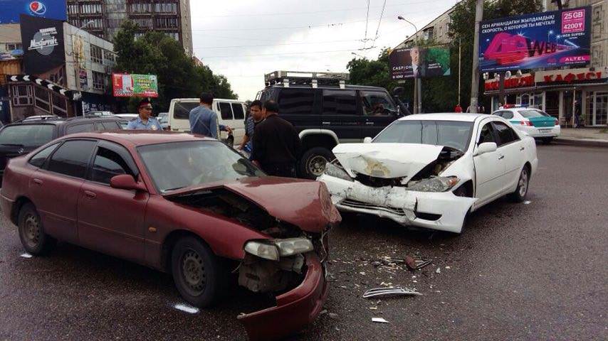Автомобиль Маzda, выезжая с парковки торгового центра, столкнулся с Toyota Camry. В результате столкновения пострадал водитель Camry, отказавшийся от госпитализации. Объезжая место аварии, столкнулись еще два автомобиля – Subaru и Hyundai. На улице Сатпаева образовалась пробка. На месте работают сотрудники дорожной полиции.