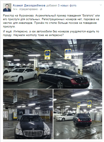В одной из социальных сетей бурное обсуждение вызвал пост алматинца, на котором запечатлен неправильно припаркованный автомобиль Maybach без номеров, передает корреспондент агентства.
