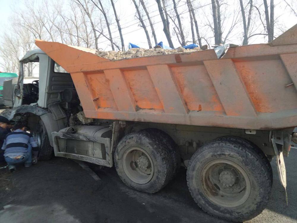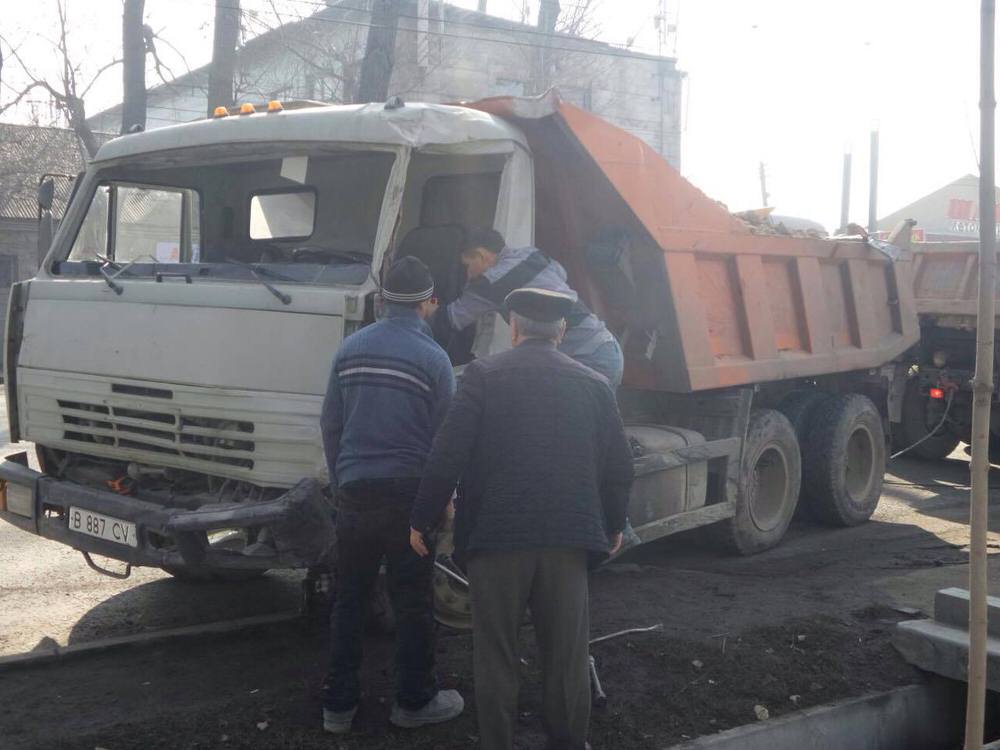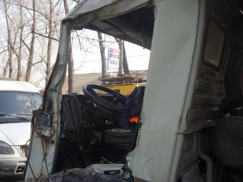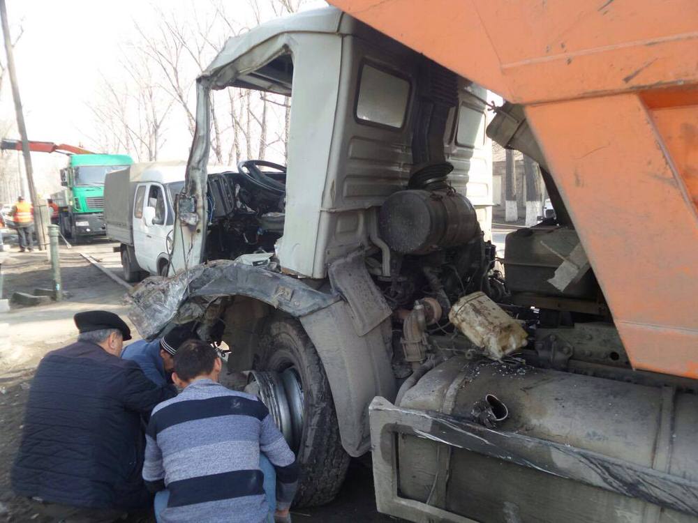 Вниз по Сейфуллина двигался автомобиль КамАЗ, неожиданно грузовик «подрезал» один из маршрутных автобусов. Уходя от столкновения, КамАЗ врезался в бетонную мачту освещения.
