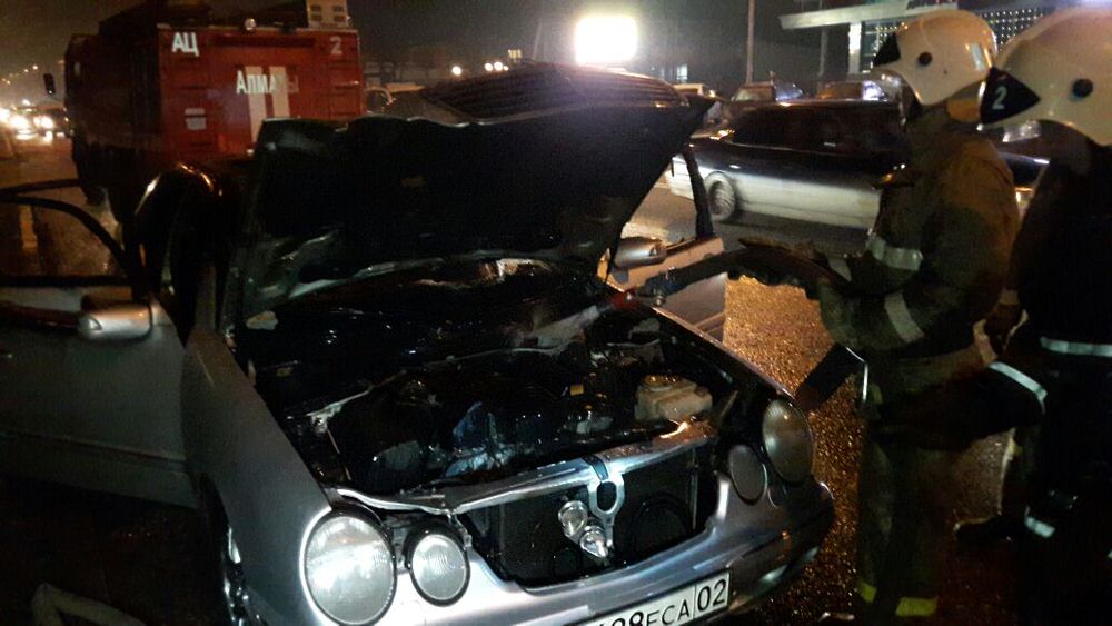 Около полуночи на пересечении улиц Райымбека и Полежаева загорелся автомобиль Mercedes. По словам водителя, он двигался по проспекту Райымбека, когда в салоне внезапно появился густой белый дым. Мужчина резко остановился и заметил, что из под днища автомобиля вырывается пламя. Вызванные на место ЧП пожарные потушили Mercedes за считанные минуты, однако салон и двигатель авто полностью выгорели. К счастью во время инцидента никто не пострадал.