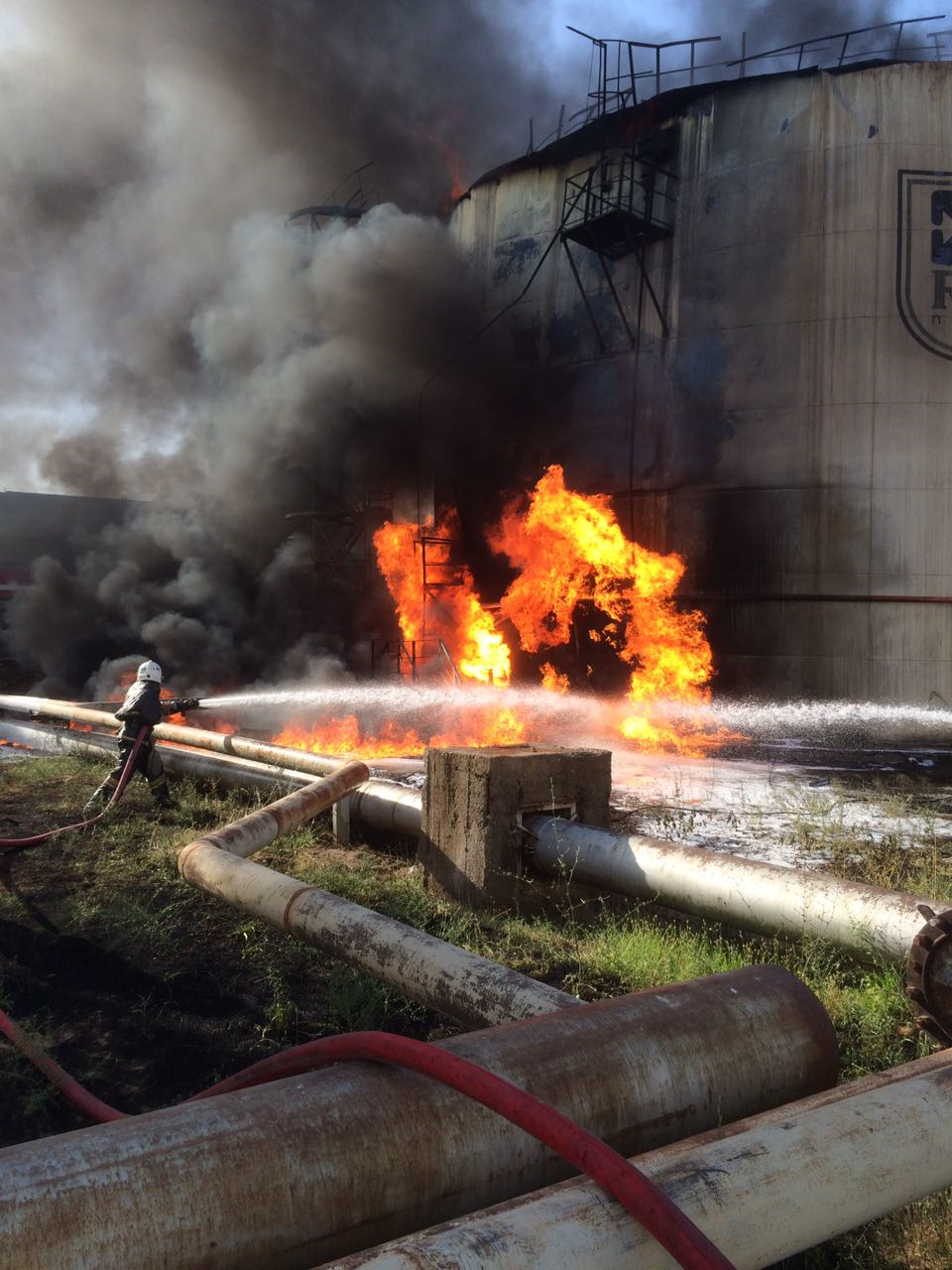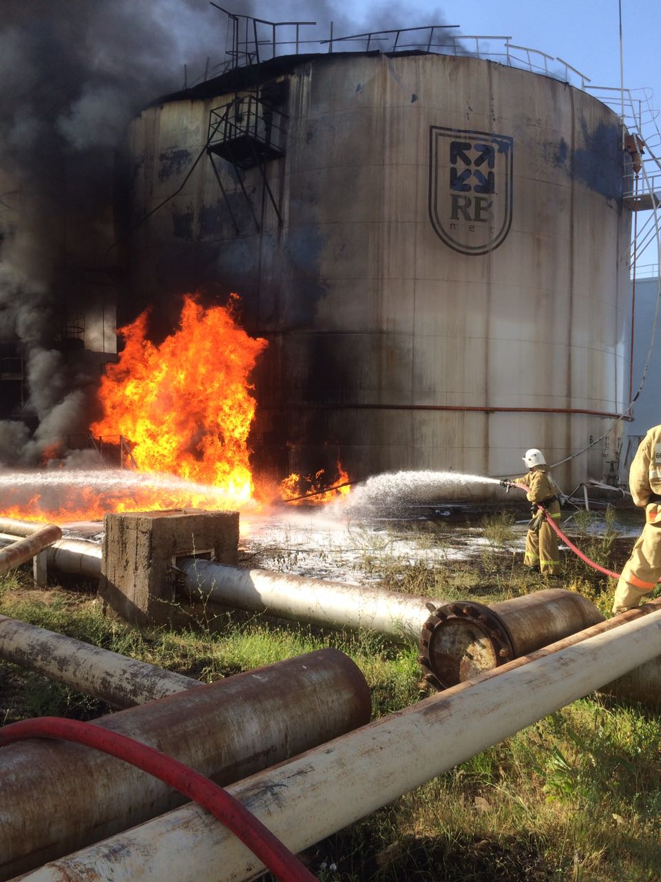 Через 11 минут по прибытии первого пожарного подразделения происходило открытое горение бензина марки АИ-92 в резервуаре (объемом 3 тыс. куб. м) на ориентировочной площади 190 кв. м с интенсивным выделением дыма и теплового излучения. Организована подача ручных стволов с большим расходом воды на охлаждение горящего резервуара.