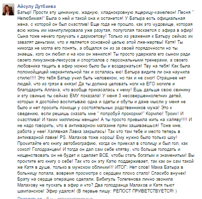 В описании к передаче говорится, что единственный сын погибшего музыканта Батырхана Шукенова - 14-летний Максут прислал из Америки видеообращение, в котором рассказал о тяжелой ситуации в семье после ухода из жизни отца. В программе выступила мать единственного наследника певца, она рассказала об отношениях с родственниками.