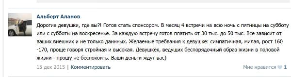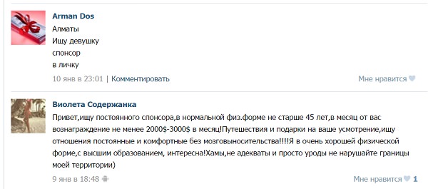 Многие объявления начинаются с поисков спонсора, который будет помогать женщинам в течение месяца, а то и нескольких лет. Девушки зачастую цену себе знают, и сумма вознаграждения за их интим-услуги варьируется в коридоре от трех до пяти тысяч долларов.