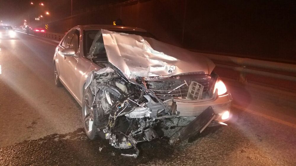 Тойота Естиму откинуло на металлическое оргаждение, а Мерседес проехал около 100 метров и остановился в силу механических повреждений.