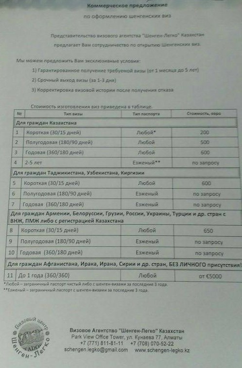 В Казахстане представителям туристических компаний приходит сомнительное коммерческое предложение об оформлении шенгенских виз для граждан стран из «черного списка», передает корреспондент агентства.