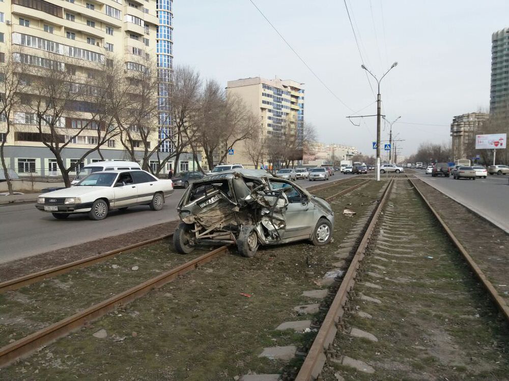 Daewoo Matiz в результате столкновения несколько раз перевернулся и остановился на трамвайных путях.