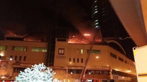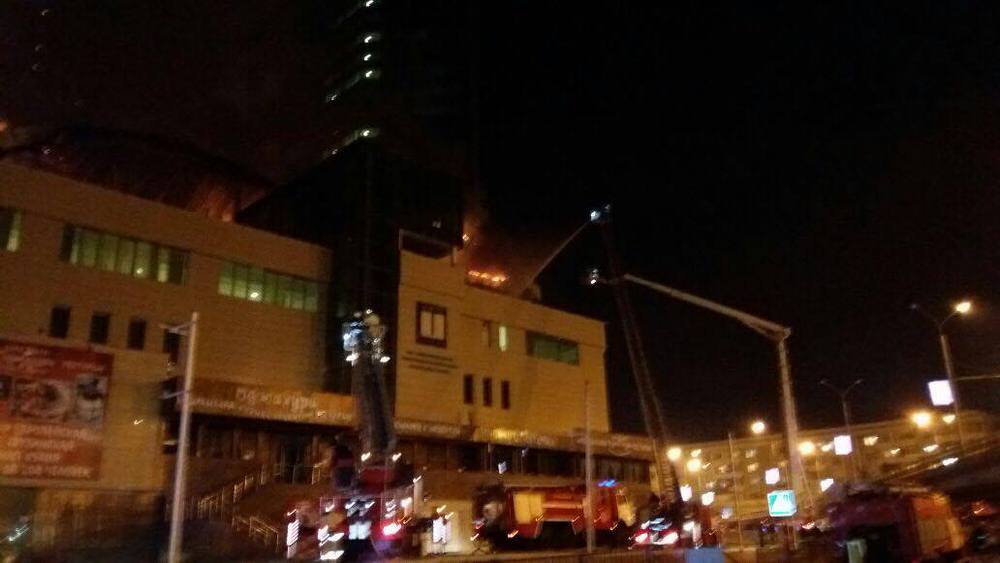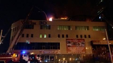К моменту прибытия пожарных обстановка была следующая: горела кровля 5-и этажного здания открытым пламенем, есть угроза распространения огня на ресторан расположенного этажом ниже. Эвакуировано 80 человек.