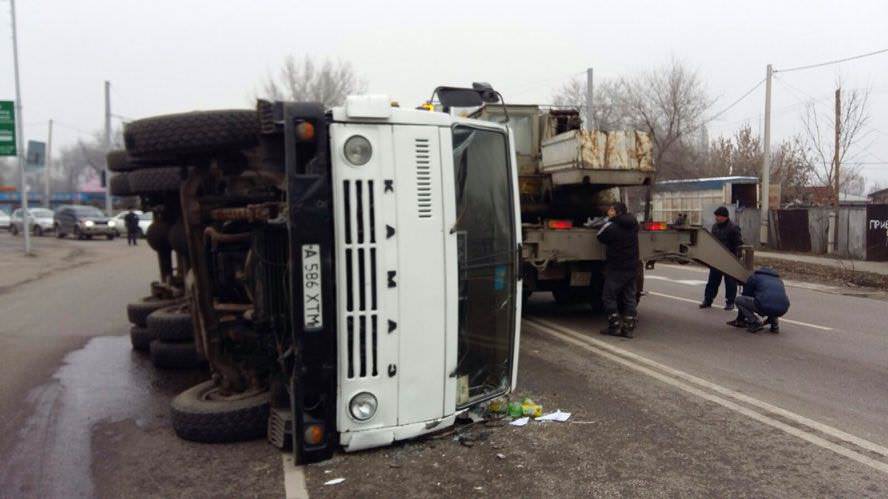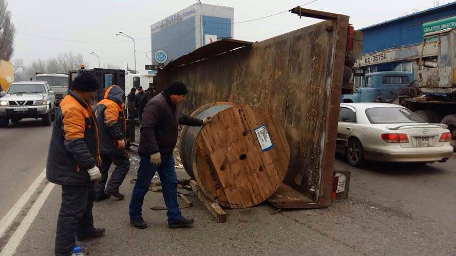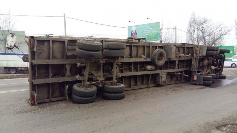 По словам водителя, он двигался на юг, и после того, как переехал улицу Серикова, одна из бухт отвязалась. В результате грузовой автомобиль перевернулся. Водитель не пострадал.