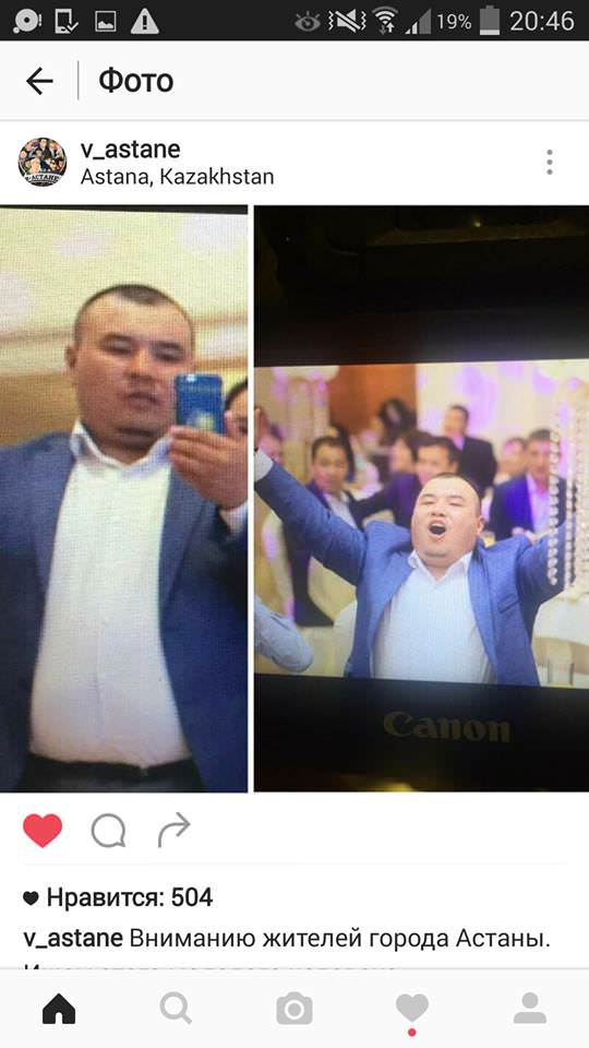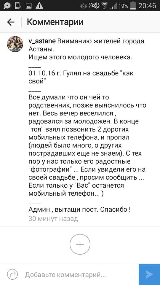 «Вниманию жителей Астаны. Ищем этого молодого человека. 1.10.2016 гулял на свадьбе «как свой». Все думали, что он чей-то родственник, позже выяснилось, что нет. Весь вечер веселился, радовался за молодоженов. В конце «тоя» взял позвонить два дорогих мобильных телефона и пропал (людей было много, о других пострадавших еще не знаем). С тех пор, у нас только его «радостные» фотографии… Если увидите его на своей свадьбе, просим сообщить... Если только у «Вас» останется мобильный телефон. Админ, вытащи пост, спасибо», - говорится в сообщении. Пострадавшие авторы не указали, в каком именно заведении проходила свадьба и известно ли правоохранительным органам о «свадебном аферисте». В комментариях пользователи сети делятся советами проверять списки приглашенных.