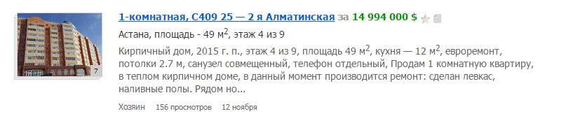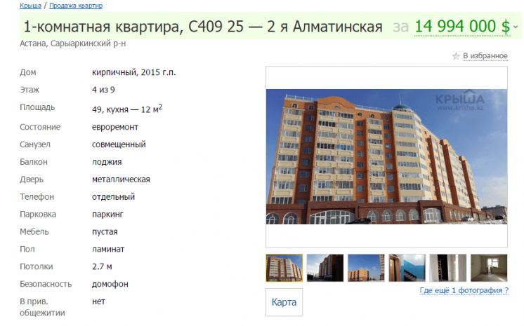 Редакция ИА Total.kz связалась с владелицей квартиры, которая заявила, что произошла ошибка и цена указана в долларах, но недвижимость стоит 15 миллионов тенге.