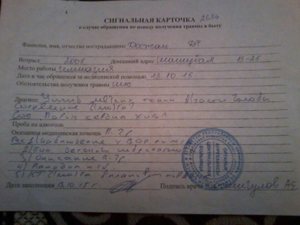 Однако в новом учебном году дело приняло еще более тяжелый оборот. Во-первых, некоторые «несостоятельные» родители все-таки забрали своих детей из гимназии. Во-вторых, в новом году незаконные поборы продолжились, к примеру, на очередное тестирование, которое на самом деле должно быть бесплатным. В-третьих, в октябре 2015 года случилось то, из-за чего маленькая Дильназ несколько месяцев была вынуждена подвергаться усиленному лечению. При заполнении бланка тестирования она ошиблась графой и написала не туда свое имя, причем она была не единственным ребенком в классе, который допустил эту ошибку. Но если другие спокойно продолжили писать контрольную работу, то здесь, непонятно по какой причине, классный руководитель со всей силы ударила девочку-инвалида по голове кулаком. И без того запуганный ребенок ничего не рассказала матери, а, придя домой, легла спать. И только вечером, после визуального осмотра и непрекращающейся рвоты, Назима Досжанова с ужасом узнала о произошедшем. Врачи скорой помощи и приемного покоя городской больницы констатировали у школьницы ушиб мягкой ткани в части головы и поставили вопрос о сотрясении мозга, о чем свидетельствует сигнальная карта.