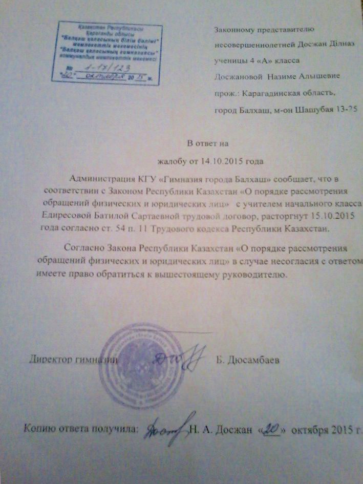 После всего случившегося разъяренная мать обратилась с жалобой в городской отдел образования. Уже там стало известно, что Дильназ не первая пострадавшая от рук учителя. На педагога к тому времени поступило уже шесть жалоб. Одному ученику учитель заклеила рот скотчем, еще одну девочку так ударила по лицу рукой, что у бедняжки были зафиксированы синяки. Директор школы подтвердил все эти факты, и благодаря расследованию Батила Едиресова была уволена по ст. 54 п. 11 ТК РК (совершение работником, выполняющим воспитательные функции, аморального проступка, не совместимого с продолжением данной работы).