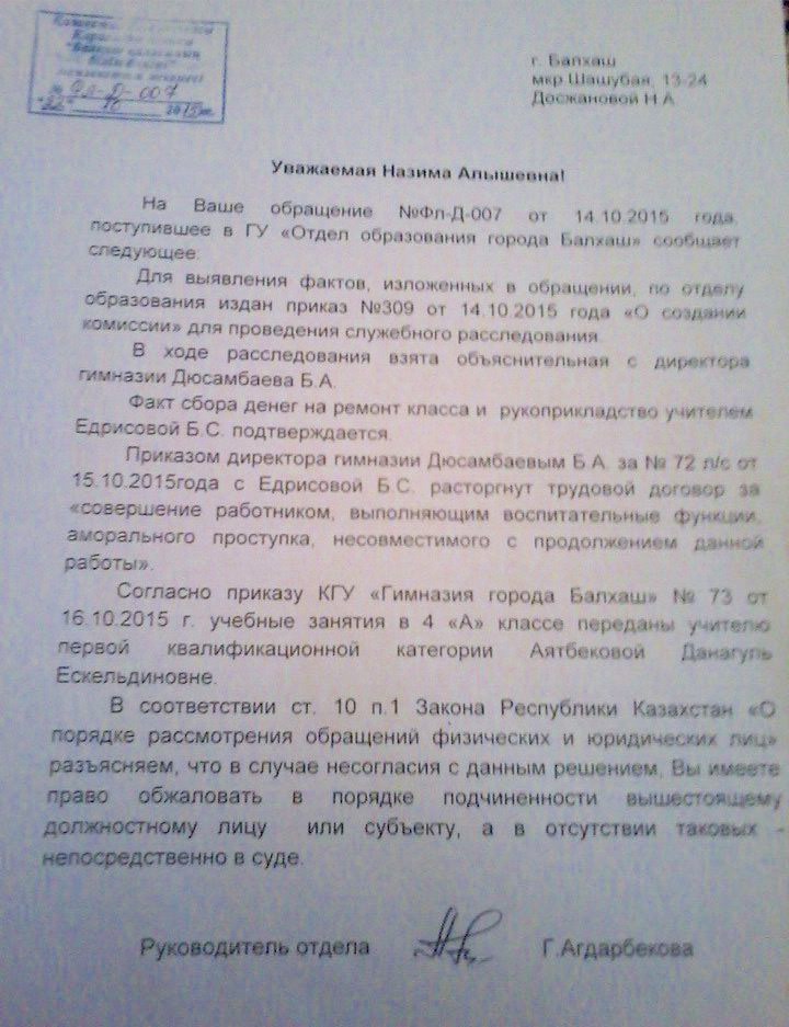 Все руководство и педагогический состав гимназии, где учится 10-летняя Дильназ знает о тяжелом материальном положении семьи. Однако это не помешало классному руководителю Батиле Едиресовой едва ли не вымогательством выбивать деньги на ремонт. Не придя к единому мнению, она начала «прессовать» детей и родителей из малоимущих семей, а также заставила их написать письмо на имя директора школы с подробным объяснением причины отказа платить не 20 тысяч, а ту сумму, которую они смогли бы осилить. Кроме того, по словам Досжаной, педагог настроила против нее группу состоятельных родителей, которые к тому же имели непосредственное отношение к ремонту. Мать одной из учениц являлась подрядчиком, и именно ее бригада должна была приступить к работе, как только сдадут деньги все родители.