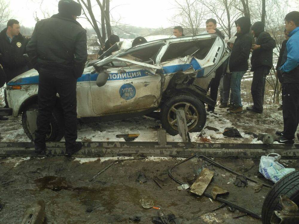 По предварительной информации, в полицейскую «Ниву» на полном ходу врезалась автомашина Suzuki Grand Vitara. В результате столкновения один сотрудник полиции, находящийся в салоне, погиб на месте, второй – в крайне тяжелом состоянии доставлен в больницу.