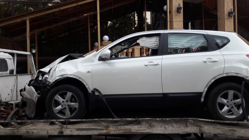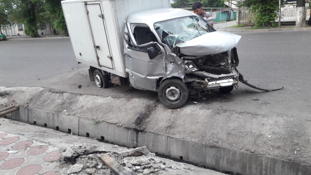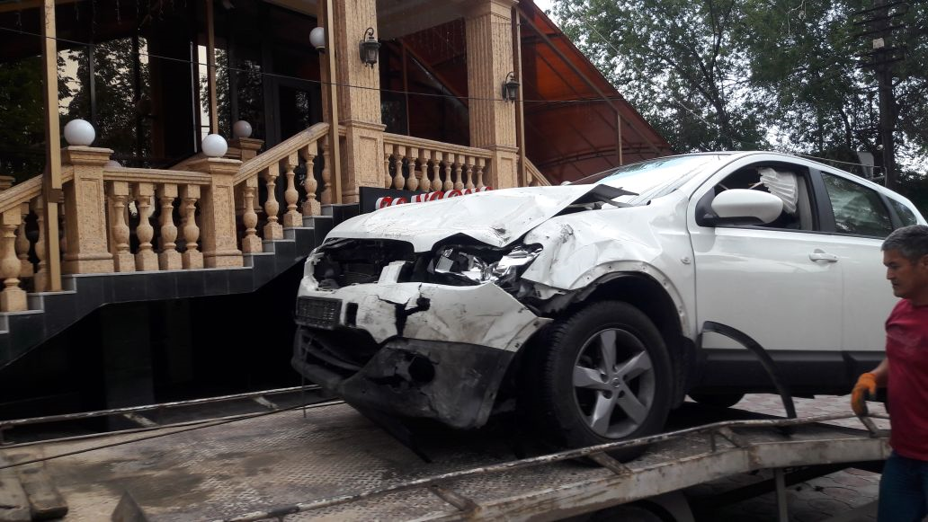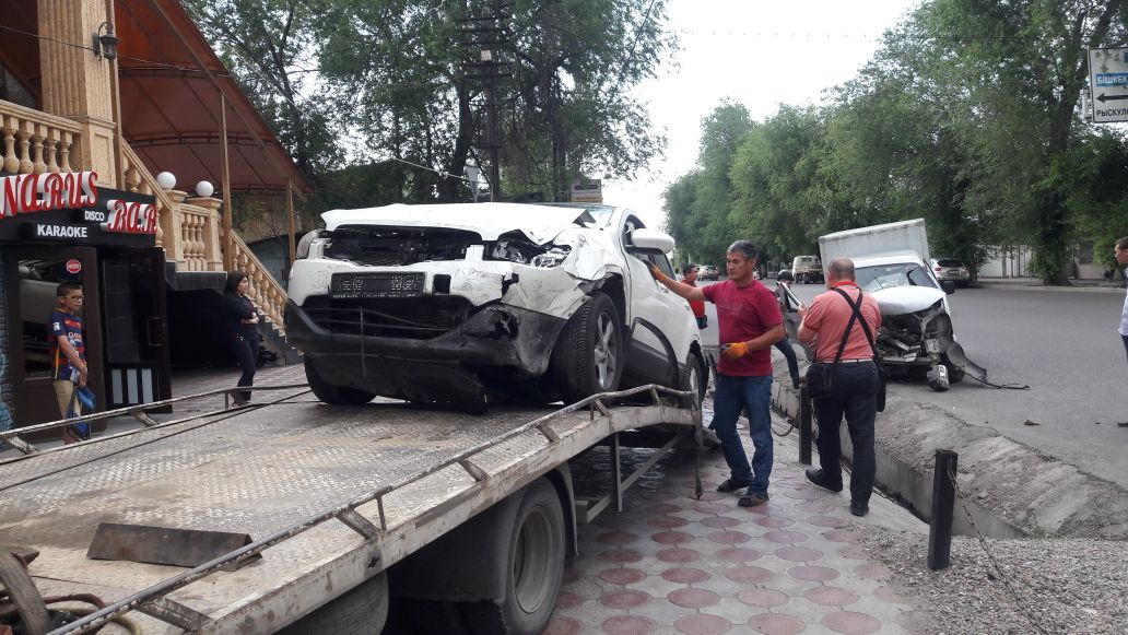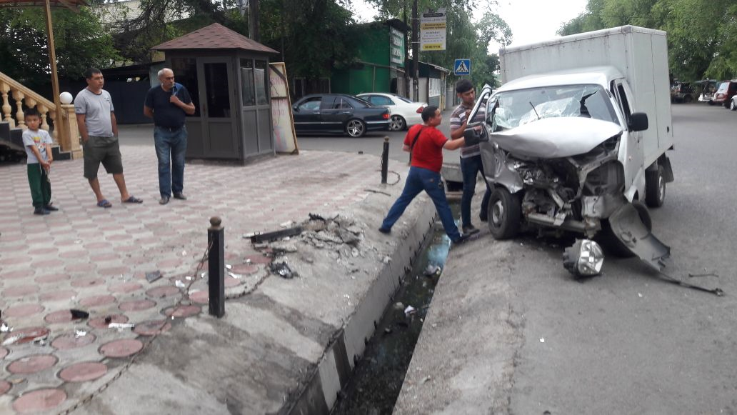Перед пешеходным переходом перед грузовиком останавливается «Сузуки Гранд Витара». Грузовик прозевал дистанцию и во избежание столкновения резко вырулил влево на полосу встречного движения. В этот момент по Жансугурова в южном направлении ехала автомашина «Ниссан Кашкай», произошло лобовое столкновение, в результате чего «Ниссан» перелетает через арык.