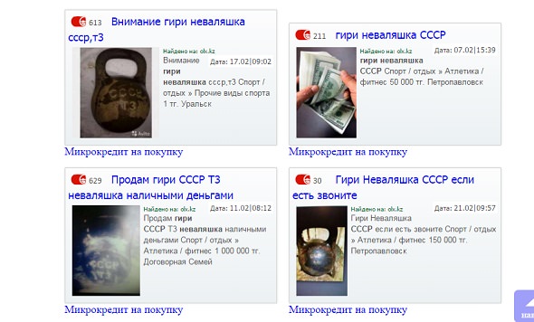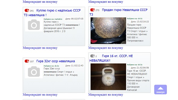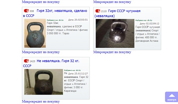 Часто встречаются объявления о покупке гири-«неваляшки» 16-32 кг. Стоимость этих предметов колеблется от 50 тысяч до 2,5 млн тенге. Самую хорошую цену предлагают скупщики из Восточно-Казахстанской области, там гиря 16 кг оценивается почти в три миллиона тенге.