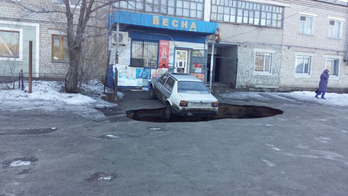 Пользователи социальных сетей публикуют фотографии автомобиля, который упал в яму в поселке Затобольск Костанайской области.
