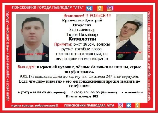 В случае, если кто-то владеет информацией о месте нахождения Дмитрия Кривошеева, родные просят связаться и рассказать им об этом по телефонам: