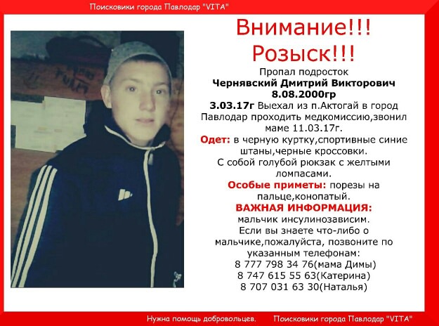 Между тем в Павлодарской области пропал еще один подросток – Дмитрий Чернявский. В последний раз он звонил матери 11 марта, с тех пор о нем ничего не известно. Сельский мальчик проходил в городе медосмотр и должен был находиться на лечении в стационаре.