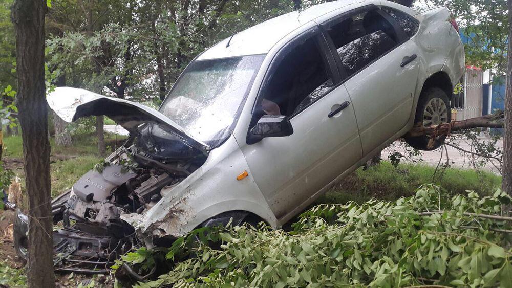 Уточняется, что Lada помимо этого снесла пару деревьев, на одном из которых повисла. Водителя российской машины госпитализировали.