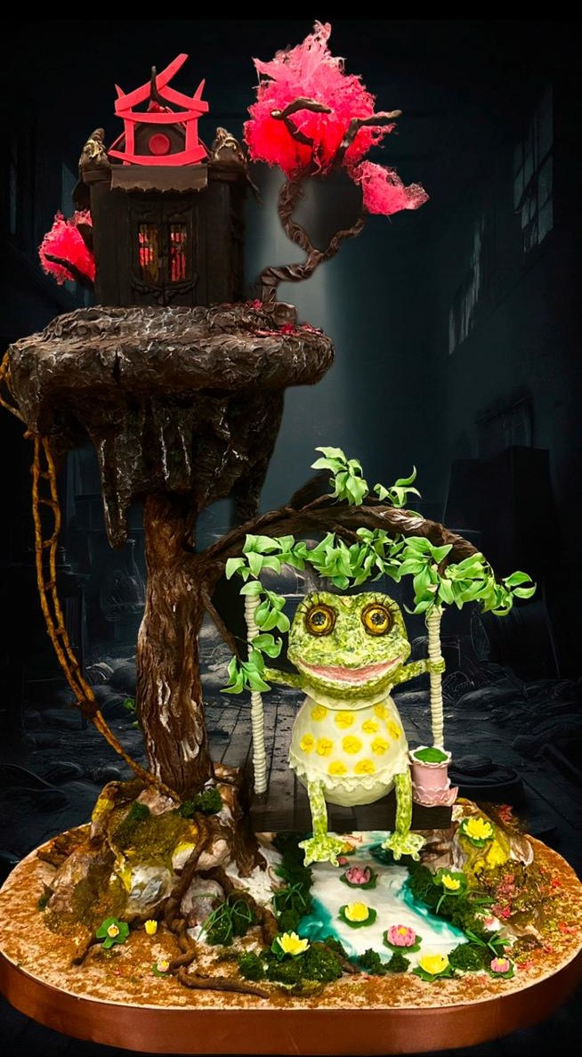 Например, композиция с лягушкой представляет собой многоуровневую арт-скульптуру, сочетающую элементы японской эстетики и сказочного мира. На вершине скалистого утеса возвышается шоколадный японский дворец с ажурными деталями и окнами, сквозь которые пробивается мягкий свет, создавая ощущение живого пространства. Рядом декоративное дерево с нежными цветами, подчеркивающее атмосферу восточного сада, напоминающего фантазийную сакуру.