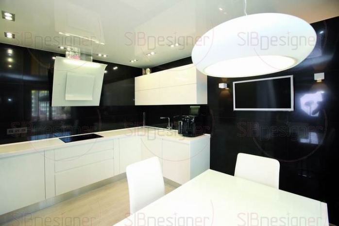 В кухне задан выразительный контраст глянцевых холодных фасадов гарнитура с не менее «зеркальным» керамогранитом графитного оттенка, которым выложены стены. Отделка выполнена так, что кажется, будто поверхность стен монолитна. На таком глубоком темном фоне выразительно смотрится светлая мебель.