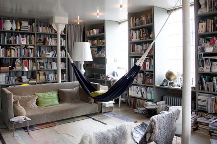 1. Просторная гостиная способна вместить в себя не только многочисленные полки с книгами, но и достаточно крупное изделие из плотной ткани. Гамак прикреплен к двум колонам, которые стиль разделяют пространство. Удобно отдыхать и наслаждаться печатной литературой, а главное - такое сооружение выдержит достаточно большой вес и вряд ли когда-нибудь упадет.