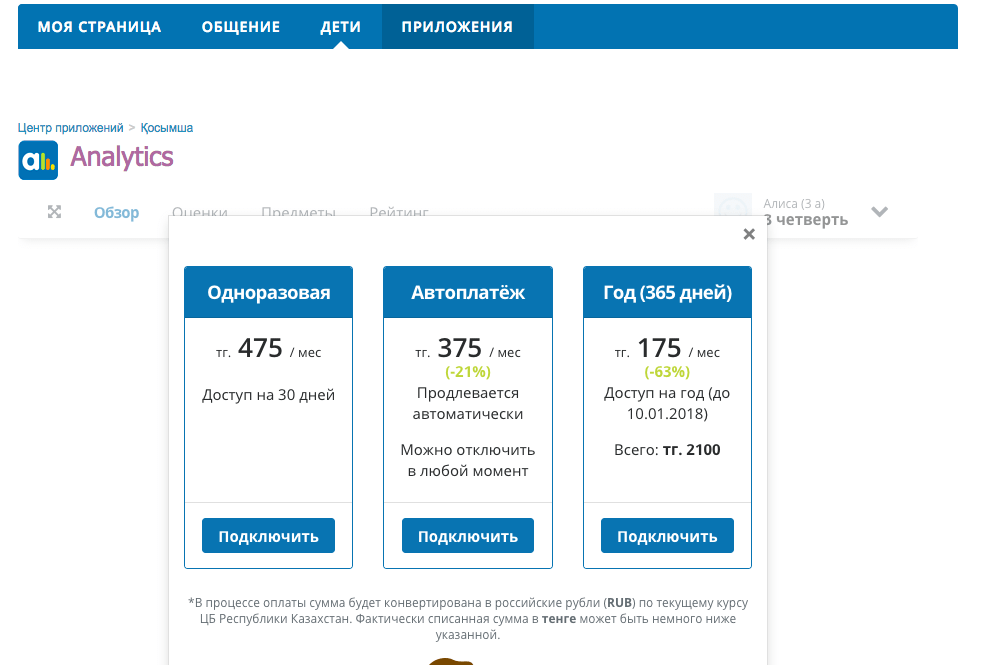 Неудивительно, что разработчики системы не удержались от желания заработать. Как указывается в официальном пресс-релизе на самом сайте Kundelik.kz, «с системой будут работать 1,5 млн учеников и более 2 млн родителей. На конец октября в системе уже зарегистрировано 2068 из 7432 образовательных организаций Республики Казахстан. Подключение новых школ происходит ежедневно». Родителей даже не предупредили, что «электронный дневник» – платный. После первого месяца бесплатного пользования необходимо подключить опцию рейтинга ученика в классе, и только потом предоставляется доступ к ежедневным оценкам. Причем в процессе оплаты сумма конвертируется в российские рубли. И на этом ТОО может заработать, по разным оценкам, от 4,8 млрд до 9,8 млрд тенге в год. Расчет прост: месячная стоимость приложения – 475 тенге, разовая плата за год –2100 тенге со скидкой в 63 процента. 475 тенге умножаем на 9 месяцев (продолжительность учебного года) и на 2,3 млн человек, получается 9,8 млрд тенге за учебный год. Если по 2100 тенге с 2,3 млн родителей, то 4,8 млрд тенге в год, не считая заработка на рекламе. Министра Сагадиева о наличии этой опции в известность, похоже, не поставили.