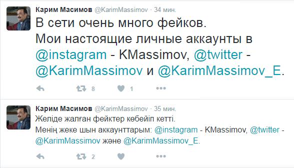 Он написал на русском и казахском языках об одном аккаунте в инстаграме, а также указал два аккаунта в твиттере. «В сети очень много фейков. Мои настоящие личные аккаунты в Instagram – Kmassimov, @twitter - @KarimMassivov и @KarimMassimov_E», - привел их премьер.