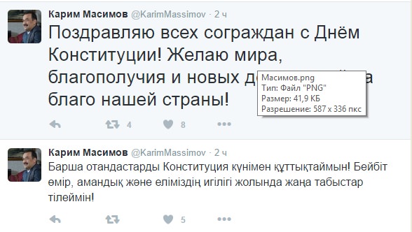 Поздравление премьер-министр РК Карим Масимов разместил в своем twitter-аккаунте.