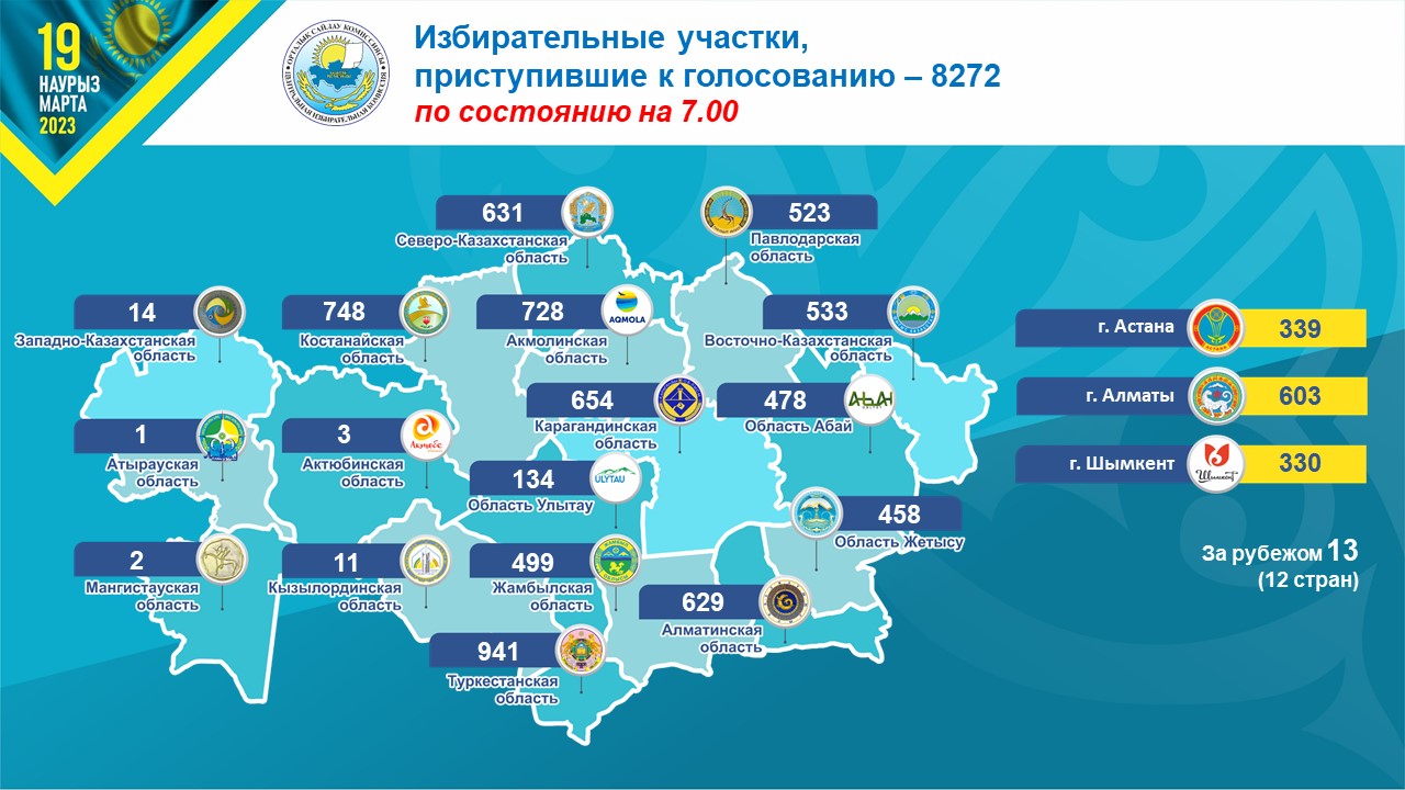 «По данным территориальных избирательных комиссий областей, городов республиканского значения и столицы, по состоянию на 7.00 времени столицы в регионах приступили к голосованию 8272 участка. Также голосование началось на 13 участках в 12 иностранных государствах за пределами страны», — сообщил Константин Петров.