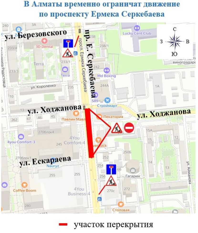 «С 07:00 22 сентября до 07:00 23 сентября 2024 года в Бостандыкском районе Алматы будет закрыто движение для автотранспорта по пр. Е. Серкебаева от ул. Ескараева до ул. Ходжанова. Временные ограничения вводятся для восстановления асфальтобетонного покрытия дороги, где велась реконструкция по замене трубопровода общей протяженностью 1097,5 метра, введенного в эксплуатацию с 1976 года, проходящего под проезжей частью названного уличного сегмента», — говорится в сообщении ТОО «Алматинские тепловые сети».