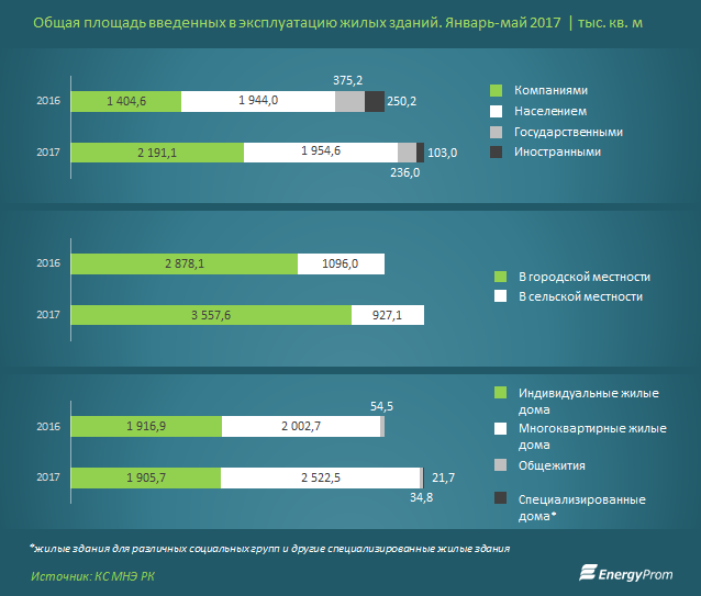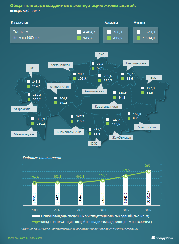 В региональном разрезе наибольшие объемы ввода жилья в январе-мае 2017 пришлись на Астану (1,32 млн кв. м, сразу +36,9% за год) и Алматы (760,1 тыс. кв. м, +4,6% за год). Среди областей в лидерах Мангистауская область (393,9 тыс. кв. м, +21,9%).