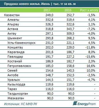 Цены на новое жилье продолжают снижение. Так, по итогам июня цена «квадрата» составила 249 тыс. тг, за месяц - без изменений, за год - минус 1,5%.