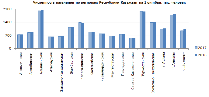 «По сравнению с 1 октября 2017 года численность населения увеличилась на 237 400 000 тысяч человек, или 1,3%. За рассматриваемый период наибольший общий прирост наблюдался в городах республиканского значения: Шымкенте (67 429 человек), Алматы (55 139 человек) и Астане (40 113 человек)», — говорится в распространенном сообщении.