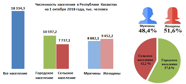 По информации пресс-службы комитета по статистике МНЭ РК, численность населения страны на 1 октября 2018 года составила 18 334 300 человек, в том числе городского — 10 597 200 человек (57,8%), сельского — 7 737 100 человек (42,2%).