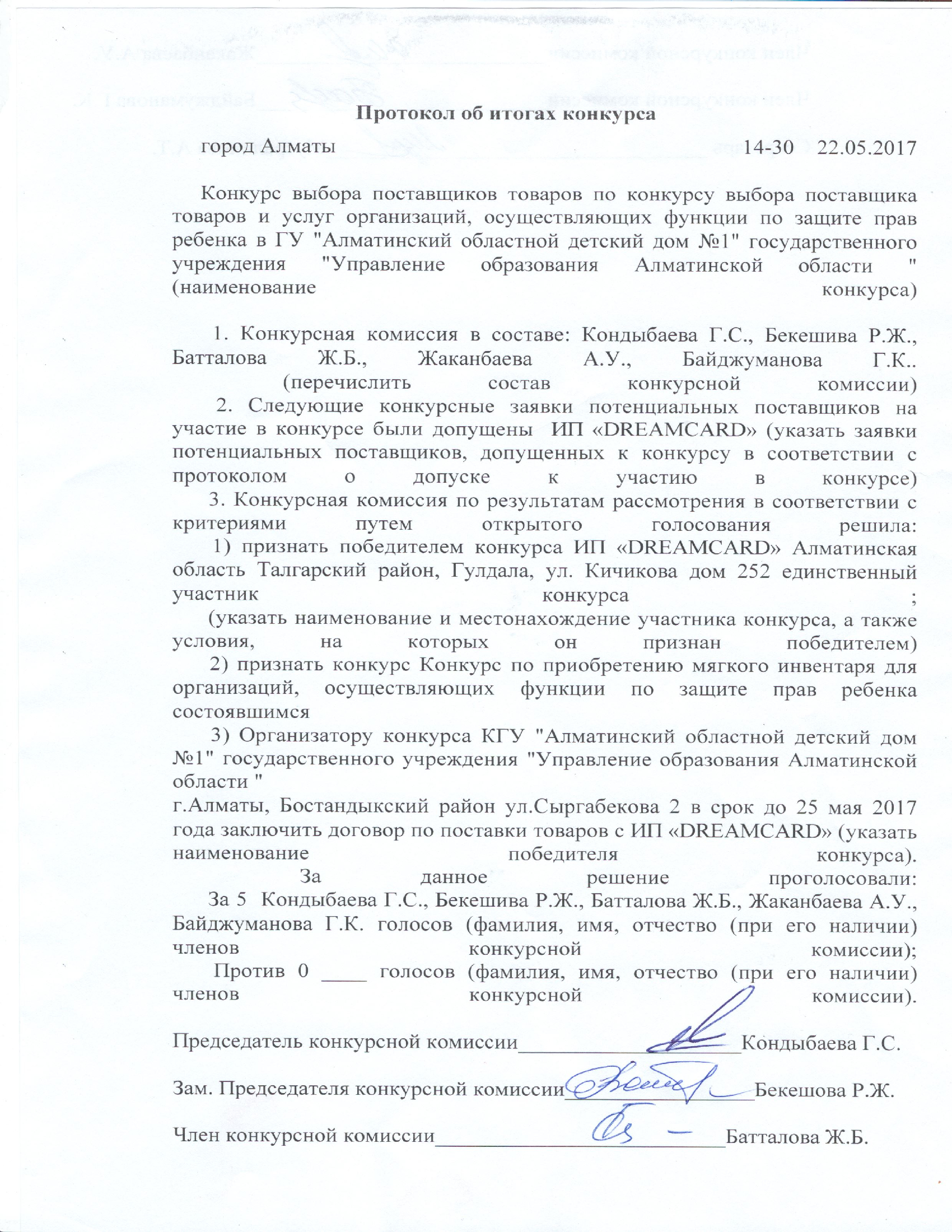 Заявку на участие, судя по опубликованным на сайте документам, подала только одна компания – ИП «Dreamcard» (учредитель – Торебай Ардак Туребаевич, 1977 г.р.). Конкурсная комиссия во главе с директором детдома Гульмирой Кондыбаевой пришла к мнению, что документы потенциального поставщика соответствуют всем требования. В итоге ИП было допущено. Позже единственного участника – ИП «Dreamcard» – выбрали победителем, а конкурс, несмотря на отсутствие других возможных потенциальных поставщиков, признали состоявшимся.