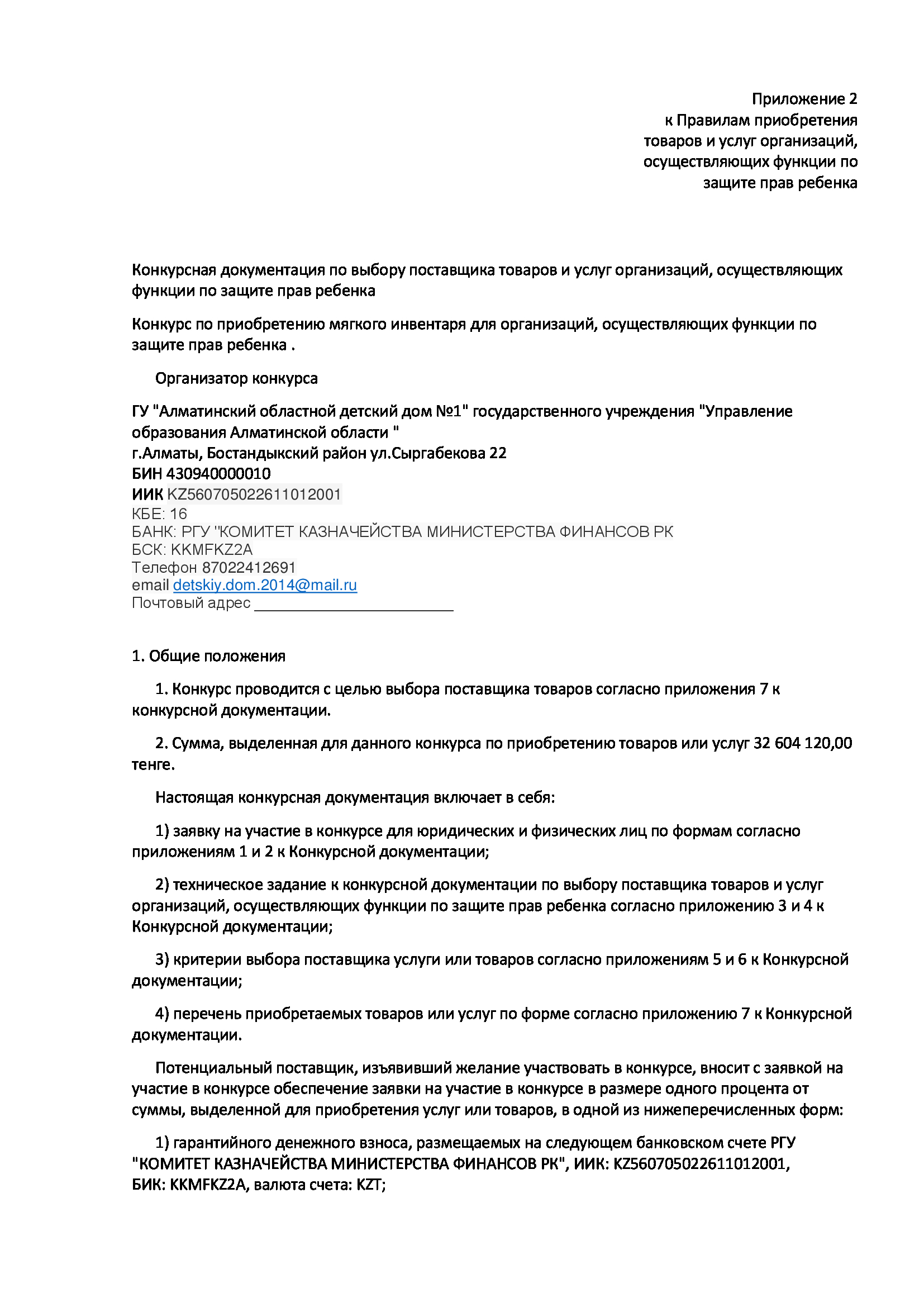 Из опубликованных документов следует, что Алматинский областной детский дом №1 объявил конкурс по выбору поставщика товаров – мягкого инвентаря (всего – 62 наименования товаров; поясним, под «мягким инвентарем» подразумевается постельное белье, полотенца, одежда и обувь для воспитанников, а также спецформа для обслуживающего персонала – прим. ИА Total.kz).