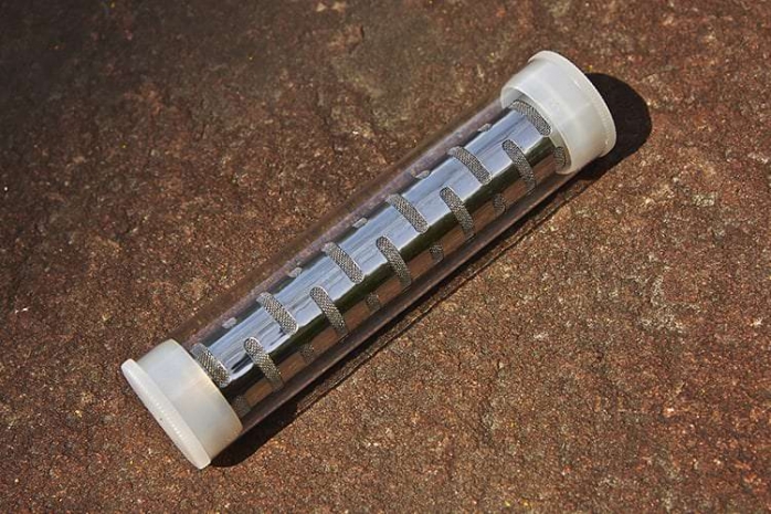 Палочка упакована в картонную коробку вместе с краткой инструкцией и специальным футляром, в котором ее можно брать с собой, к примеру, на работу. Сама палочка изготовлена из нержавеющей стали с прорезями, закрытыми тонкой сеточкой. Внутри – небольшие светлые гранулы главного действующего элемента.